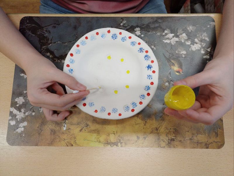 ⚡ Сегодня ребята работали с полимерной глиной, не требующей обжига, иными словами, с самозатвердевающим материалом. Сначала раскатали глину в пласт, затем вырезали круг ⭕ по диаметру тарелки-заготовки. Потом этот "блинчик" положили внутрь заготовки и придали форму тарелки. 🥏 Во время декорирования использовали технику оттиска штампами. Роль штампиков выполняли узорчатые пуговки, колпачки от фломастеров ✏️ и деревянные палочки. Сохли изделия несколько дней. Для росписи тарелочек использовали акриловые краски 🎨 и ватные палочки.