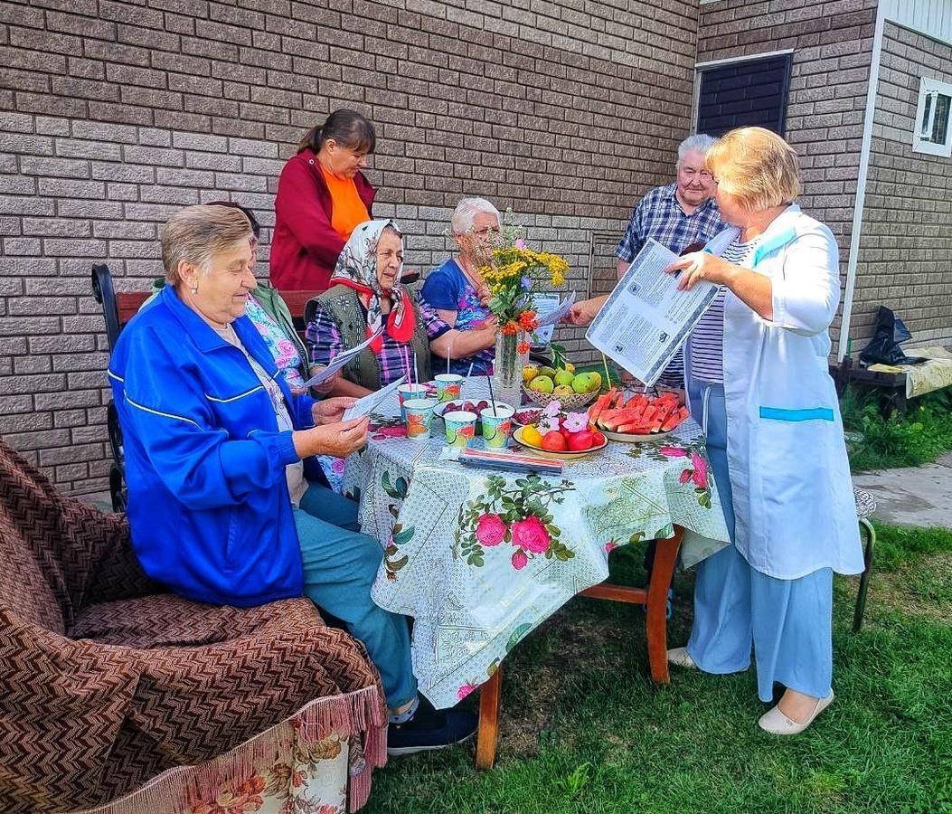 Медицинская сестра О.Н. Коткова и социальный работник О.М. Гусева рассказали участникам встречи о том, какие продукты особенно полезны осенью, как правильно рассчитывать количество овощей и фруктов в рационе, сколько жидкости стоит употреблять ежедневно. А чтобы закрепить знания на практике, для всех приготовили вкусный и освежающий арбузный смузи. На свежем воздухе, за чашечкой витаминного напитка, участники душевно пообщались и зарядились хорошим настроением.